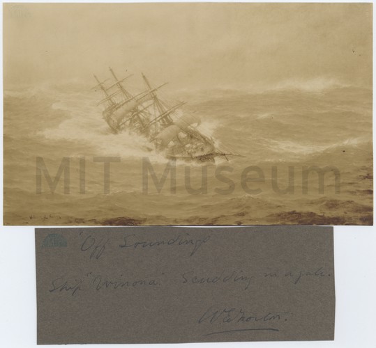 Woodblock print, oban tate-e. A mother and three of her children (one on her back) walking along the shore with fishermen whaling in the background.