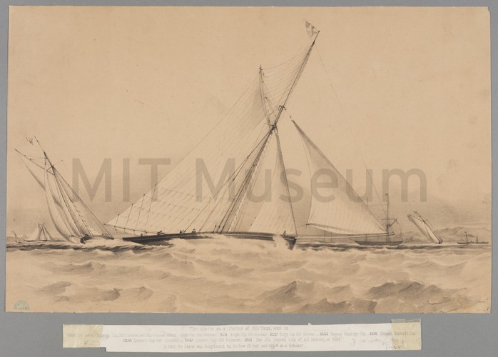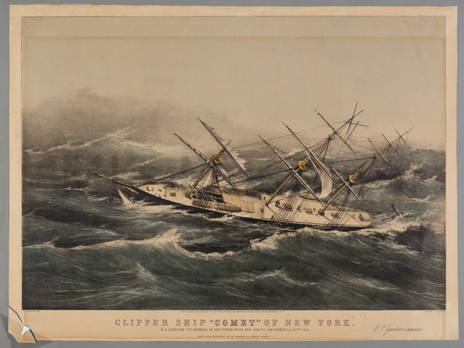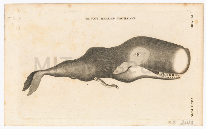 Colored image depicting a seal hunt. In the foreground lies a large seal, and two others stick their heads out of the water. Behind them, men on a whaleboat ready their clubs as seals approach fron a cordoned-off patch between whaleboat and land. On land, behind them, men with clubs chase bounding seals towards the sea. There is a large three-masted ship at right.