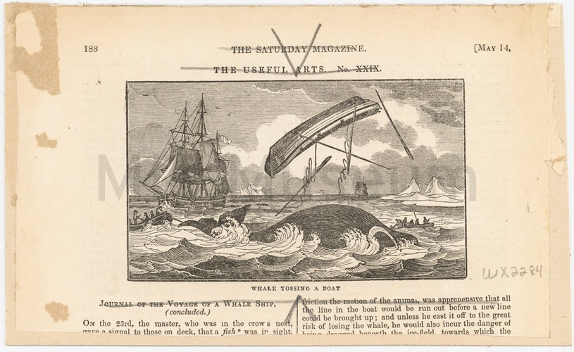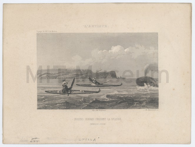 Hand-colored engraving depicting men in single-occupancy canoes hunting spouting whales and narwhals in Arctic scenery while a group of walruses look on in the foreground. Labeled "T. LXI. 163."