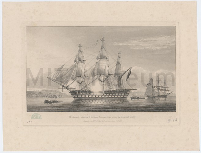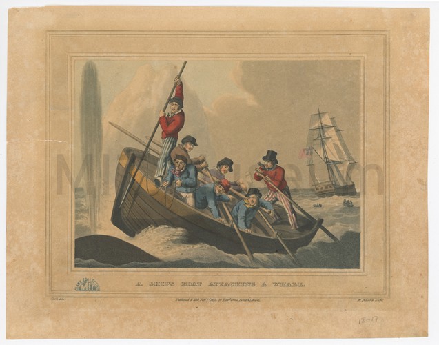Colored engraving depicting men on a tropical shore carving up the carcass of a seal. A man in the foreground, his jacket unbuttoned and his feet and calves bare, directs the others. In the background are three whaling boats, and a ship at sea. Labeled "T. LXIII. 166."