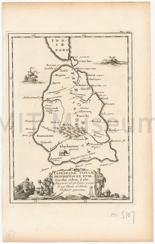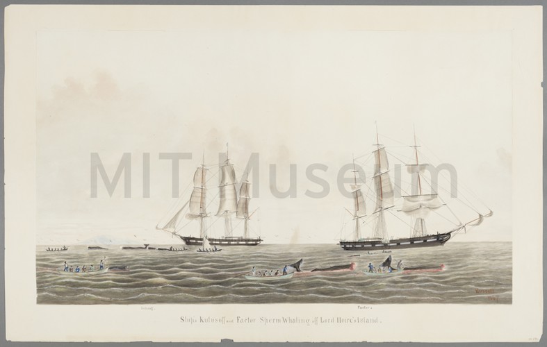 Hand-colored engraving of men at work on whale products. In two scenes. Top, one man pours a bubbling liquid from a large ladle over a cauldron, while another uses a long knife on some sort of leatherlike skin laid on a workbench. Below, three men work on wood box-like apparatuses with various spigots and chutes leading out of them. One man smokes a pipe. Labeled "T.LXX", and "182" on top scene, "184" on lower.