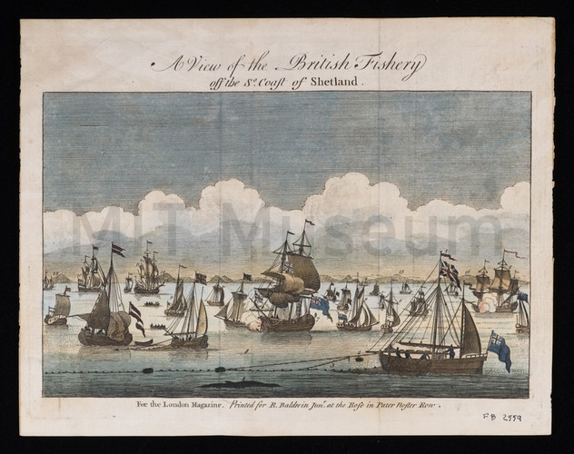 Original ink wash drawing depicting an Arctic whaling scene with two whaleboats approaching a spouting whale. No inscription.