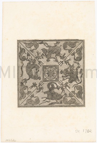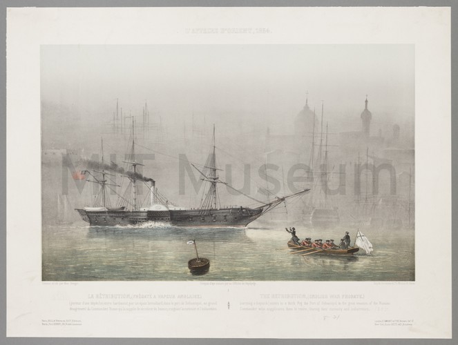 Colored woodcut showing, at right, a whaling ship with a steam engine and a sailor firing a gun mounted to the deck at a large whale, on the left-hand side of the image. A coil of rope next to the sailor is rapidly uncoiling as the projectile harpoon speeds to its mark. The whale, which is spouting, is depicted in mid-thrash: its head and tail are both above the water as it rears up.