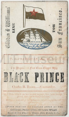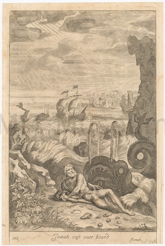 Colored print depicting a woman, in flowing pink drapery, riding atop a stylized whale or dolphin and holding a cut-glass or crystal bottle. She is accompanied by two small boys, one of whom sits in front of her and carries a bow and arrow, ready to fire, and the other of whom floats behind her, carring a small torch. Color is deposited very thickly onto the paper but due to the absence of brushstrokes, does not appear to have been hand-painted.