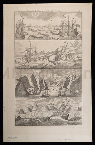Photograph of a watercolor or ink drawing of a yacht at sea; with a coastline and other shipping, including a steam vessel, in the background.
