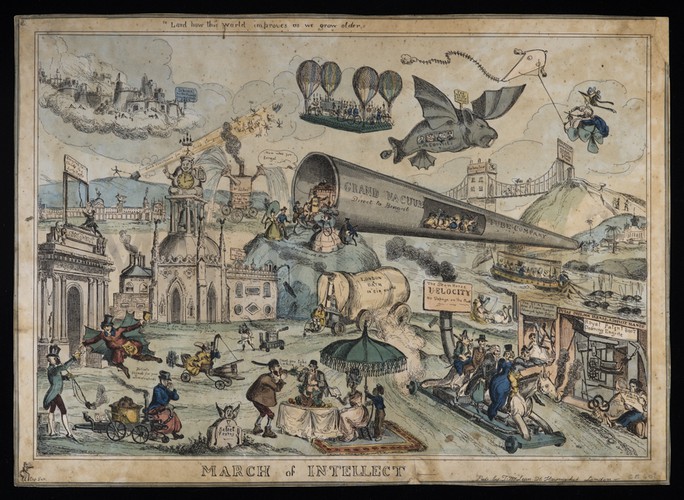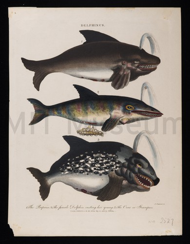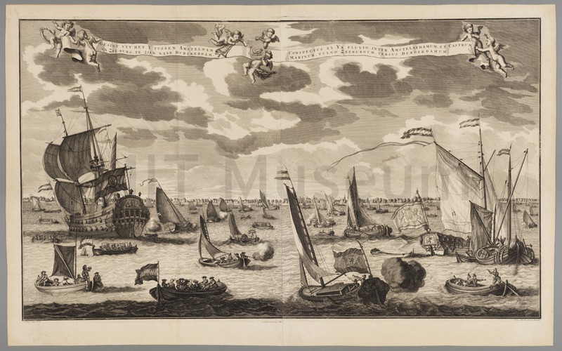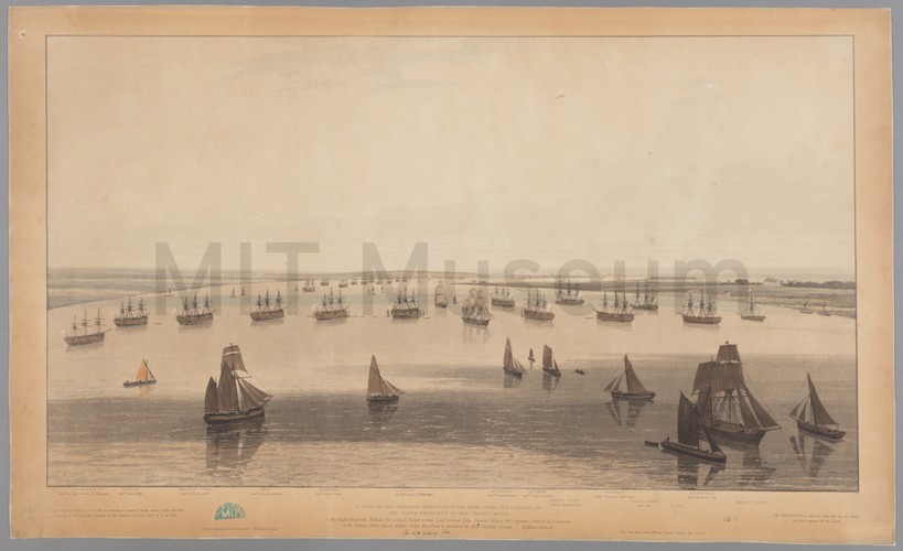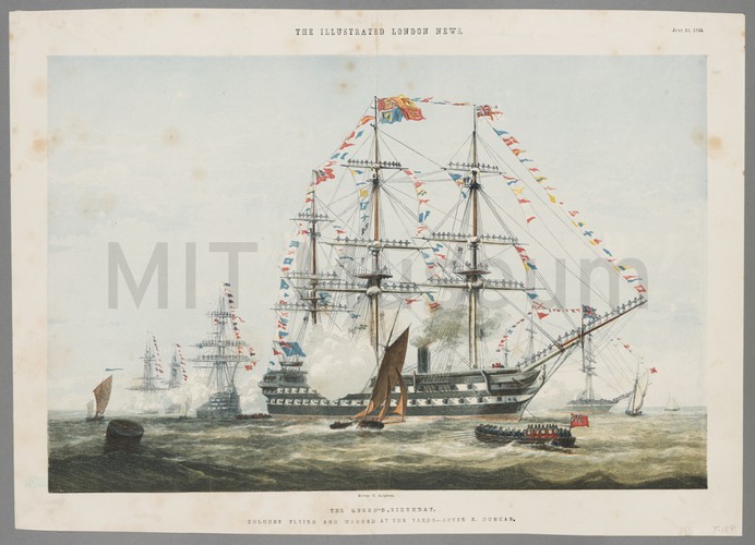 Halftone reproduction of the engraving of the Burgess-designed yacht sailing in a busy waterway. A large house complex sits by the water's edge in a rural landscape.