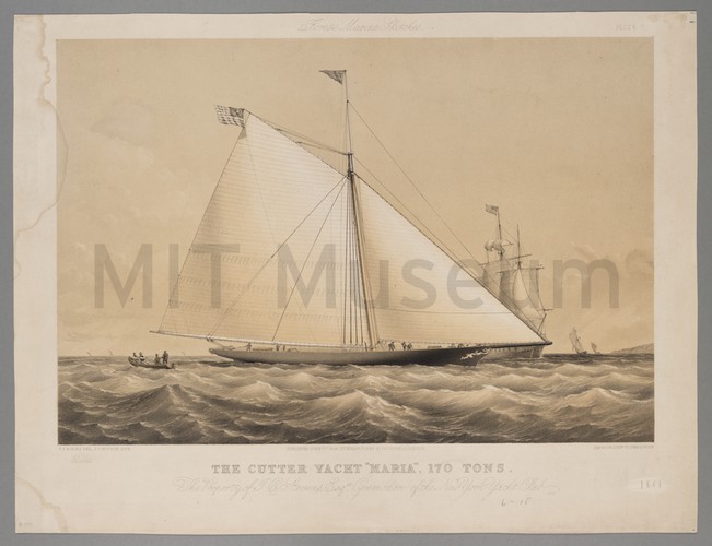 Colored lithograph depicting a moment during the Great Ocean Yacht Race of 1866 between the yachts 'Henrietta,' 'Fleetwing,' and the 'Vesta,' in which the 'Fleetwing' took a sea aboard while scudding before a hard gale. The incident washed out six of her crew out of the cockpit, and she was obliged to lay for five hours. 'Henrietta' won first place and 'Fleetwing' came in second.