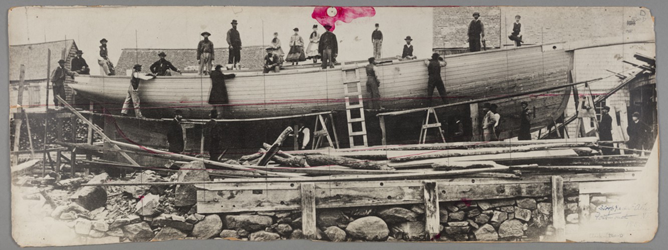A portrait of the steam yacht 'Ross Winans' breaking through choppy waters. Designed by the American inventor and engineer, Ross Winans (1796-1877), she was a prototype iron-clad vessel nicknamed "cigar ship" due to her unusual shape. Winans experimented with a series of cigar-shaped vessels in the 1850s and 1860s. He envisioned a streamlined ship with minimal superstructure that would cut through the water with greater efficiency. Despite his investment in the project, none of the Winans ship designs were widely adopted. In the print, her two propellers are prominently visible, and the flat stream of trailing smoke alludes to her speed and power. She stands in stark contrast with the traditional, square-rigged sailing vessel in the left background.