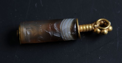 Onyx pendant on gold wire Barrel-shaped bead longitudinally perforated with central hole. Wire passes through perforation and …