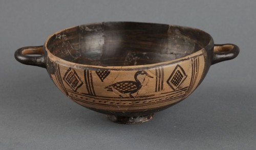 Attic Black Figure Merrythought Cup Attic black figure cup with deep bowl, high “wishbone” handles. Side A: …