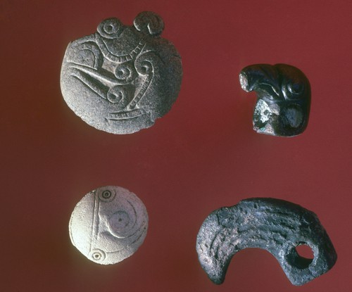Bone appliqué, decorated with curled animal Bone plaque of irregular round shape. The front side has an arcuated …