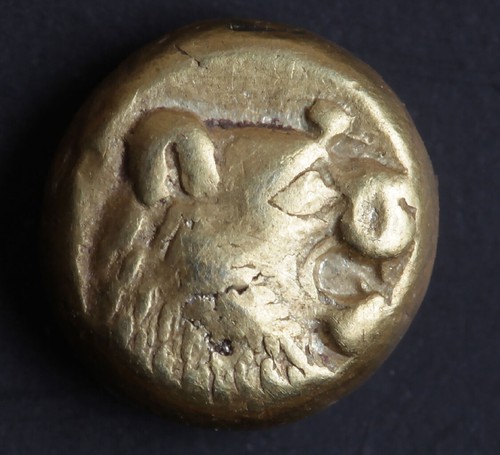 Electrum Third-Stater Electrum third-stater. Obverse: roaring lion head, facing right, with “hairy nose wart.” …
