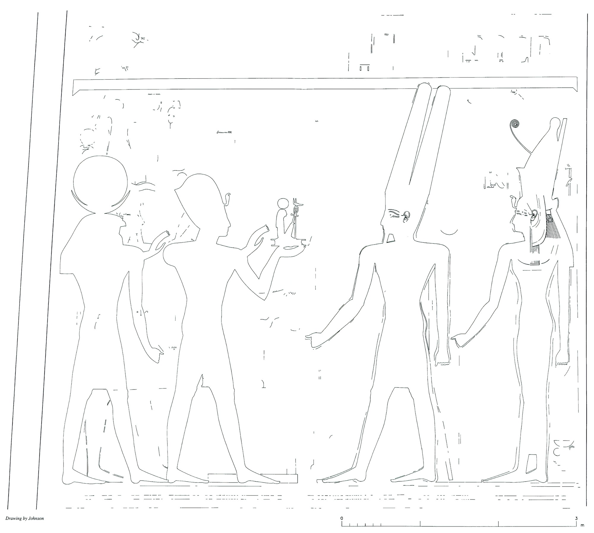 Although the faces of the two deities seem to have been incorporated into the final scene without much alteration, the stone-cutters of Ramesses II recarved the rest of their bodies and crowns in sunk relief, and with more attenuated proportions. It is therefore probable that the heads of Amun and Mut represent the only portions of the original Eighteenth Dynasty deco- ration of the facade left intact, and for that reason they are indicated here in fully weighted lines.