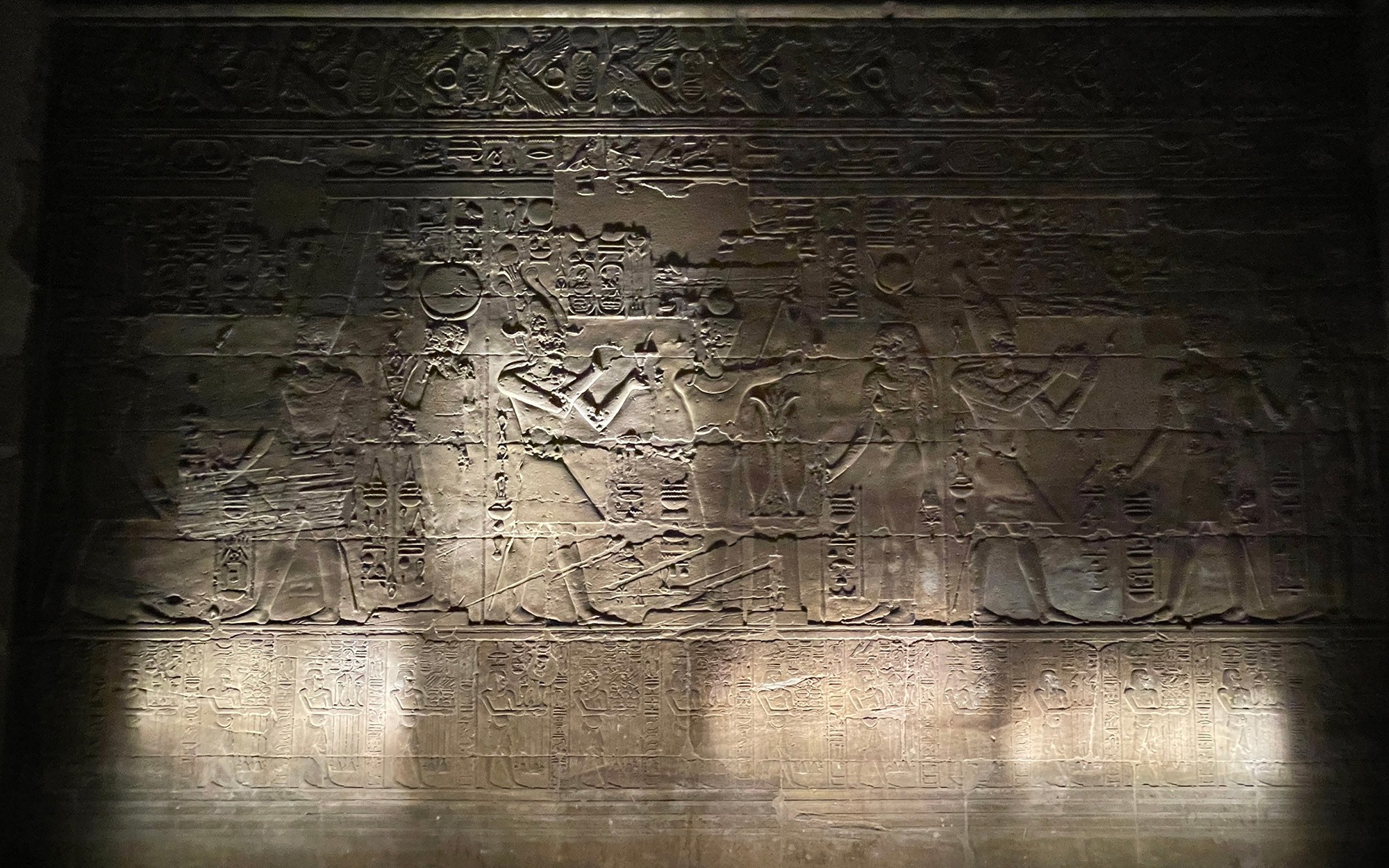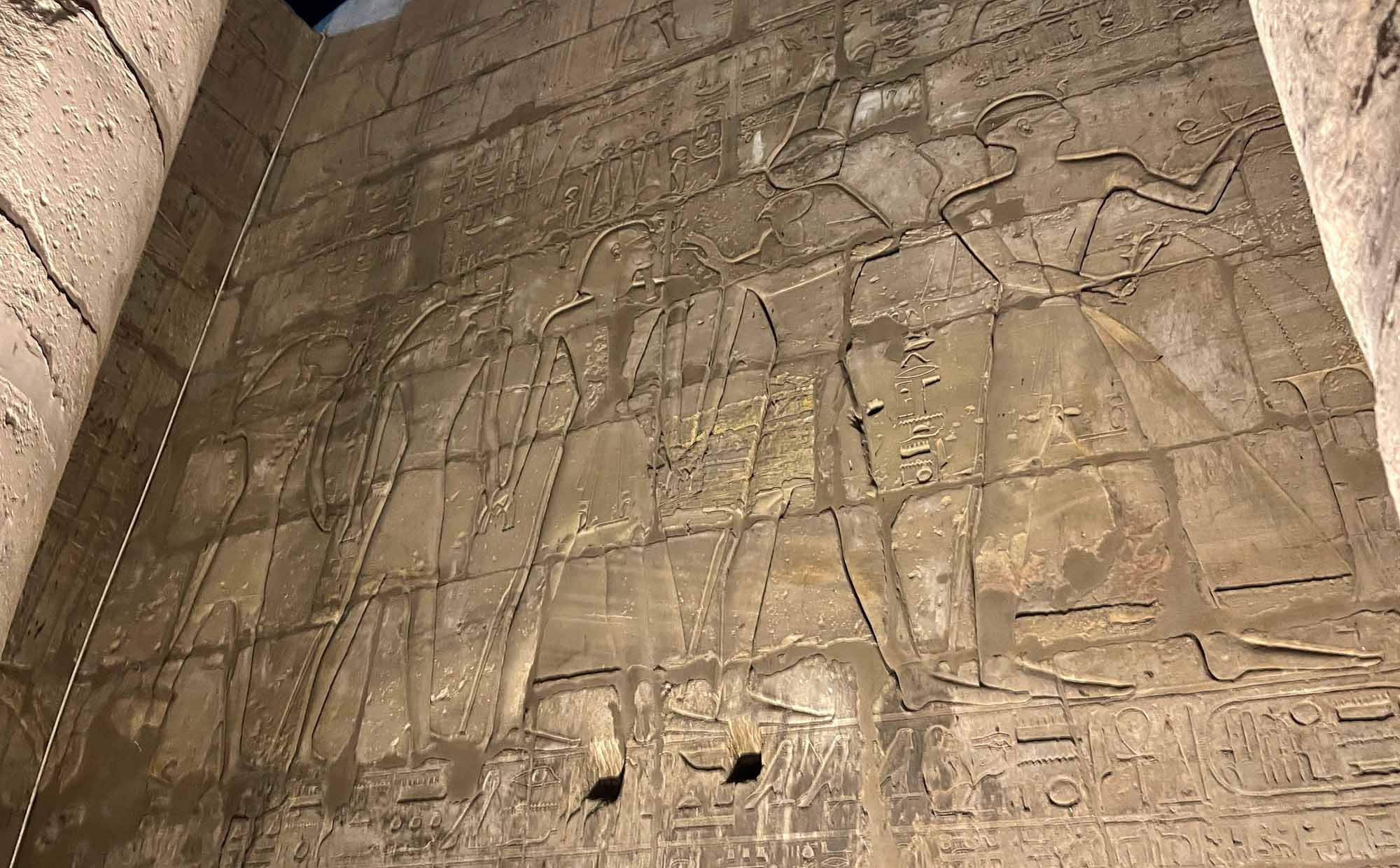 Photograph of the reliefs in the later part of the inner sanctuary added by Alexander the Great at Luxor Temple. Luke Hollis, 2022.