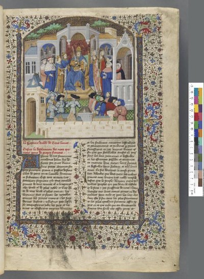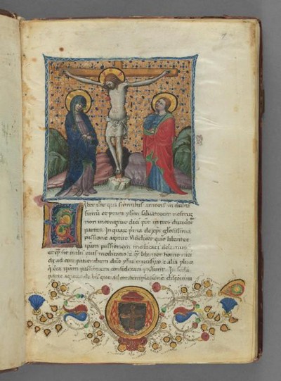 In late medieval Venice, lay confraternities developed along the lines of modern faith-based organizations such as the Lions or Knights of Columbus, designed to emulate monastic virtues in a worldly environment. Confraternities were also governed by rules and regulations, known as mariegole. Cat. no. 37 is a typical mariegola (illuminated by Benedetto Bordon and workshop around 1504), made for the lay confraternity of the Holy Sacrament of the Church of San Geminiano, Venice. Most mariegole open with elaborate frontispieces such as this one, an image of members of the confraternity venerating the Eucharist in the form of an oversized chalice from which Christ emerges as a Man of Sorrows.