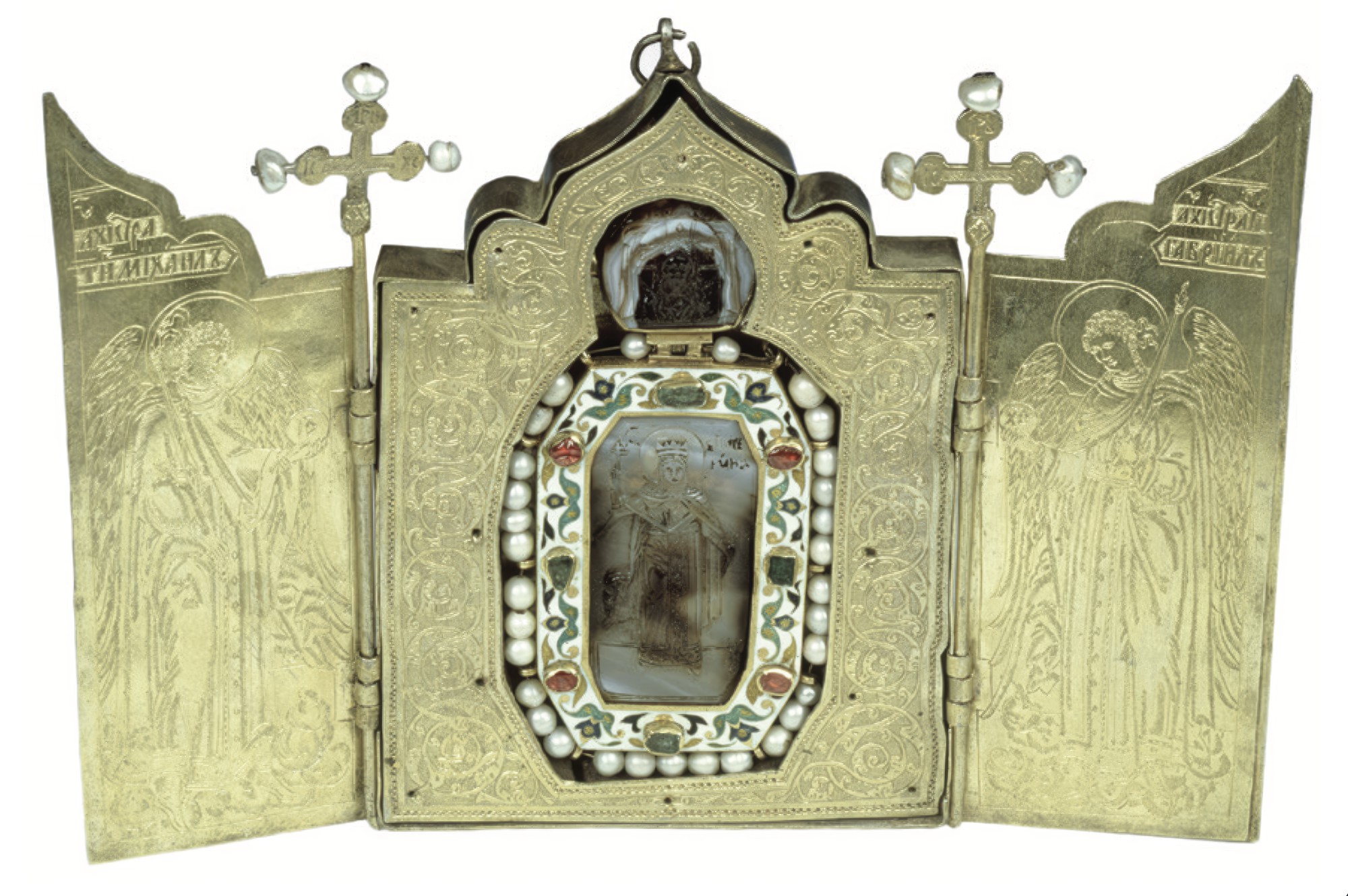 In this triptych reliquary, the figure of Saint Catherine is carved in deep relief on agate stone, encircled in a gold border. The attachment point of the suspension chain to the small-sized cameo was decorated with the scene of the Holy Mandylion, as was customary in Russian encolpia. The back-side is decorated with floral motifs in low relief, painted over with enamel. Sometimes the reliquaries themselves were covered with beautifully-decorated cloth.