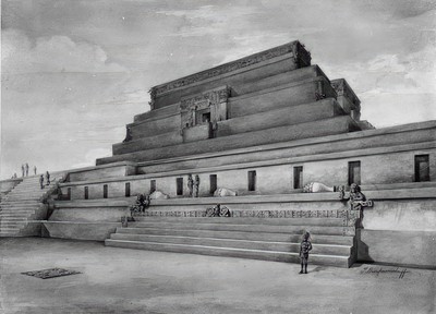 At the top of Structure 16, a person ascending the west stairway reached a two-story temple. Peering into its first-story chamber, the viewer saw an interior niche framed by a serpent's mouth, and inside the niche, a sculpture of the seated K'inich Yax K'uk' Mo'. The dramatic stairway, followed by the seclusion of the inner temple shrine, prepared visitors for a momentous encounter with the spirit of the founder.