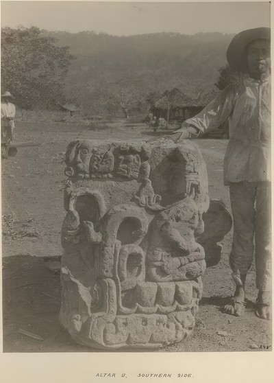 The temple atop Structure 26 continued the war-related imagery established on the Hieroglyphic Stairway. The temple was in complete ruin long before archaeologists rediscovered it in the late 1800s. Members of the nineteenth-century Peabody expedition collected large quantities of scattered sculpture from the exterior façade and interior hieroglyphic inscriptions from the fallen walls. Some 25 blocks containing portions of a lively hieroglyphic text from the temple's inner room made their way to the Peabody Museum, whose contract with the Honduran government-written more than 100 years ago-stated that the museum could remove half of what it found. Another 20 blocks or so were taken to the Honduran National Museum in Tegucigalpa. During the Carnegie Institution's excavations in the 1930s, additional glyph blocks from the same panel inscription were found as workers cleared the structure for restoration. Morley cataloged and photographed the pieces and made the first attempt to reconstruct their order (126).