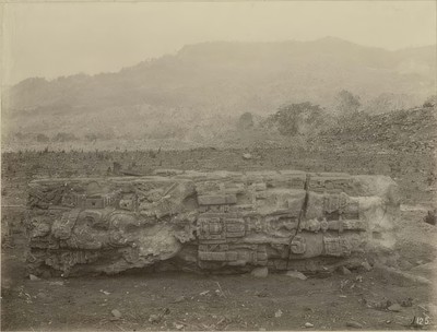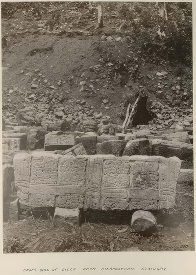 Alfred Maudslay was the first explorer to call attention to the Hieroglyphic Stairway, investigate the mound, and give the stairway the name by which it is still known today. John Owens conducted the first clearing and excavation of Structure 26 in 1891-93 as part of Harvard University's Peabody Museum expedition. After Owens died of a tropical fever and was buried in front of Stela D in the Great Plaza, his field assistant and subsequent director of the expedition, George Byron Gordon, carried on the work (123). Gordon was responsible for the initial reordering of the fallen steps of the stairway and the carvings of seated warrior figures that punctuate its ascent. He and others took photographs, which are archived at the Peabody Museum, and made molds of many of the carved risers. The photographs remain a trove of information, retaining details of the hieroglyphs now too eroded to make out. The Peabody Museum published Gordon's complete study of the Hieroglyphic Stairway in 1902, and his reconstructions and decipherments of the key dates in its text have withstood the test of time.
