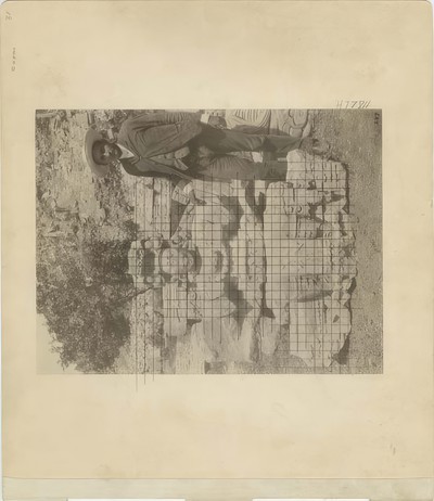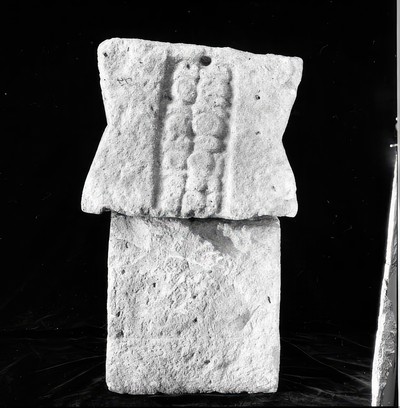 My colleagues and I believe we have identified the actual residential location associated with one of the place names on this building. The name over the pillar between the left and middle front doorways was represented by a glyph in the form of a fish. While excavating a royal family residence south of the Acropolis in the 1990s, Will Andrews and his team discovered a series of similar fish sculptures fallen from the façades. One had even been ritually buried as the major feature of a subfloor cache. This evidence supports the idea that the royal residential complex was known by this fish name, perhaps "cai nal". Possibly the fish glyph on Structure 22A referred to the same residential complex, and the figure above it, to that area's representative at community council gatherings (174).