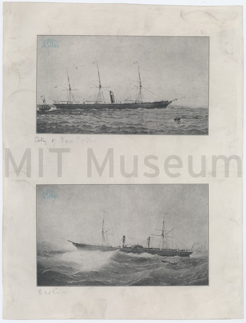 "City of New York" and "Scotia" Print with two ship portraits, which appear to be reproductions of paintings. …