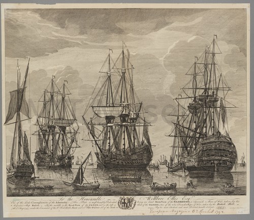 Views of the Spanish Ship "Glorioso" and the French ships "Jason" and … An engraving from a series of prints by R. Short that depict …