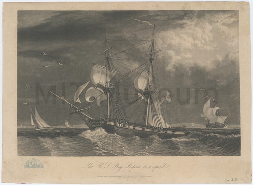 The U.S. Brig Porpoise in a squall. Side view of the brig Porpoise, her sails curling with the force …