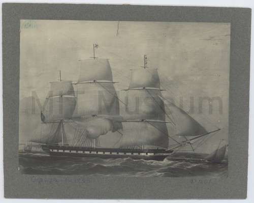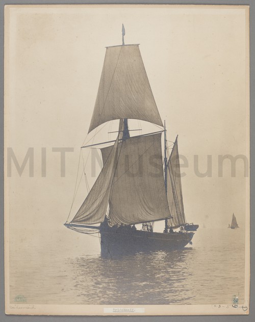 "Bridesmaid" A black-and-white photograph of the square-rigged ketch, 'Bridesmaid,' sailing in open waters. …