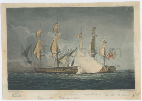 "Capture of La Guerriere by the British Frigate Blanche. Hand-colored etching depicting a naval battle between two vessels seen in side …