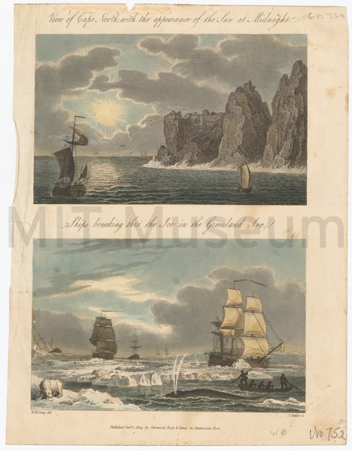 View of Cape North with the appearance of the Sun at Midnight Two colored Arctic scenes printed on one sheet. The upper scene is …