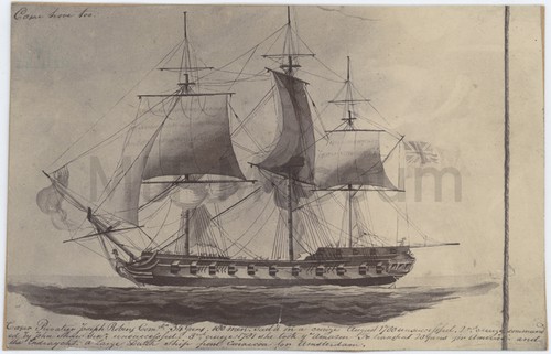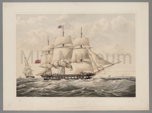 The "Vernon," East Indiaman, 1000 Tons A hand-colored lithograph of the starboard view of the frigate built East …