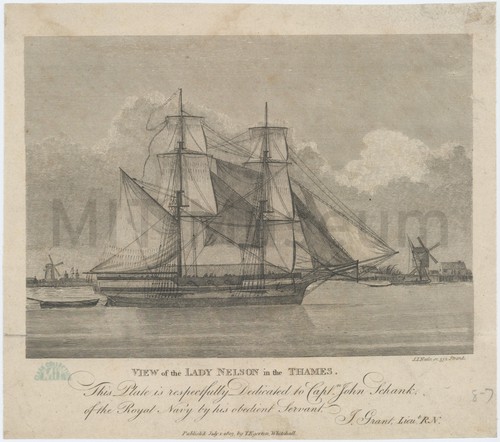 View of the Lady Nelson in the Thames. Side view ship portrait of the exploration vessel "Lady Nelson" sailing on …