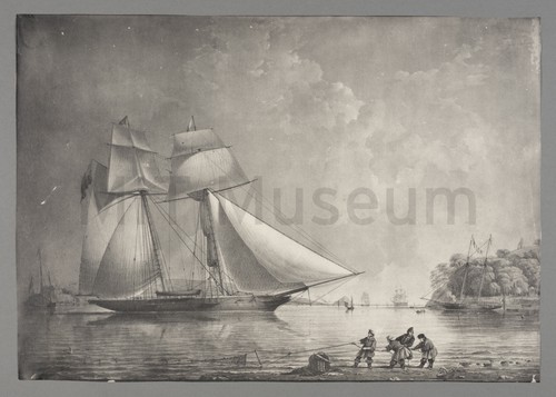 "Caesar" hove to. Photograph of a watercolor ship portrait, showing the privateer vessel "Caesar" in …