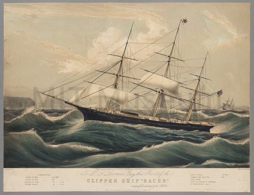 To D. L. Lawrence, Esq. this Print of the Clipper Ship "Racer." A hand-colored lithograph of a port-broadside view of the clipper ship 'Racer' …
