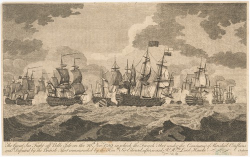The Great Sea Fight off Belle Isle on the 20th Nov. 1759 Uncolored copperplate engraving depicting a naval battle between the French and British. …