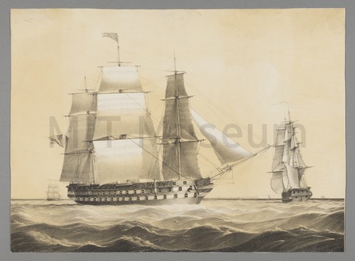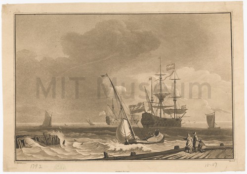 Two Dutch Line of Battle Ships at Anchor and Several Small Boats Believed to be a lithograph copied from a 1792 etching by Apostool …