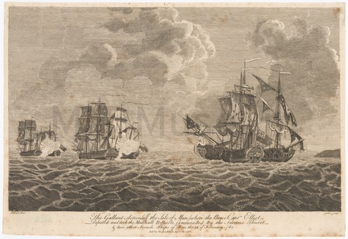 The Gallant Action (Off the Isle of Man) where the Brave Captn. … Engraving depicting a naval battle between three pairs of ships; in each …