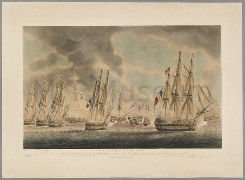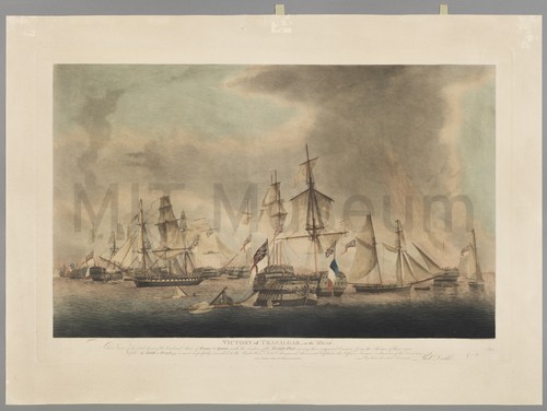 Victory of Trafalgar, At the Van Hand-colored aquatint after a painting by Robert Dodd depicting British and French …