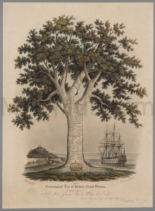 This Genealogical Tree of British Naval Victors... Hand-colored aquatint of a large tree overlooking the sea with the names …