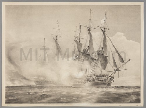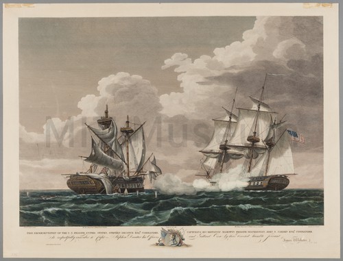The United States Capturing the Macedonian An engraving of a naval battle after a painting by Thomas Birch. …
