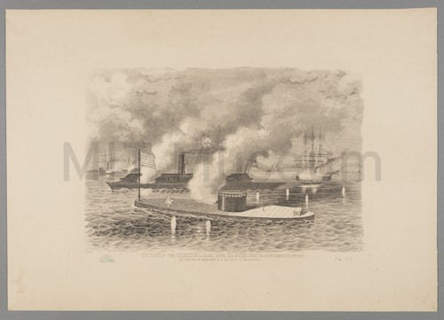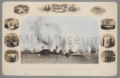 The First Naval Conflict Between Iron Clad Vessels, In Hampton roads March … This colored lithograph was created by Charles Parsons for the Endicott lithography …