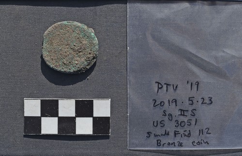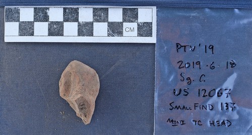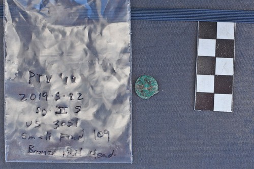 Lead sling bullet Trench A. Cast lead sling bullet. Complete. Uninscribed. Slight traces of casting …